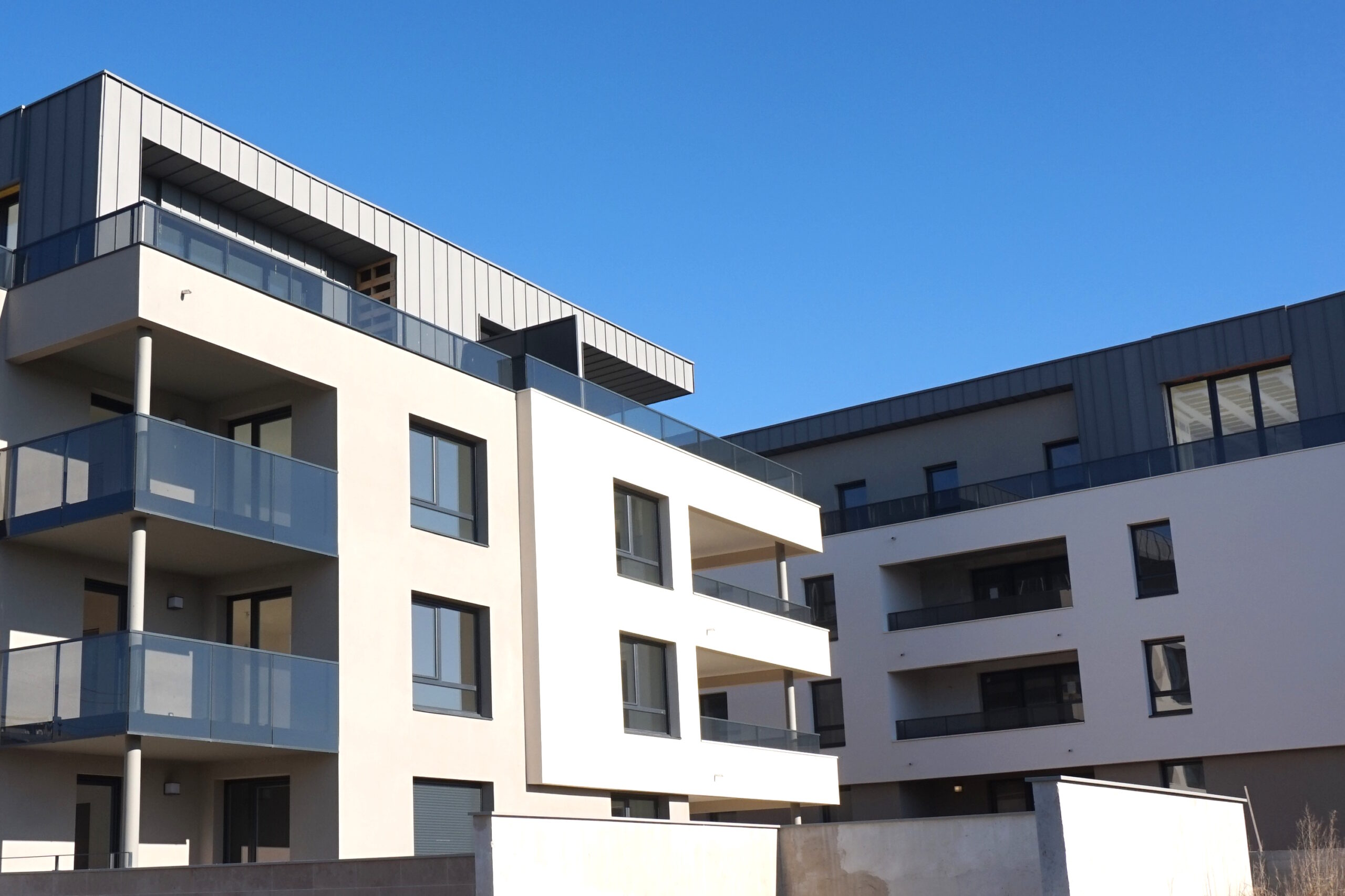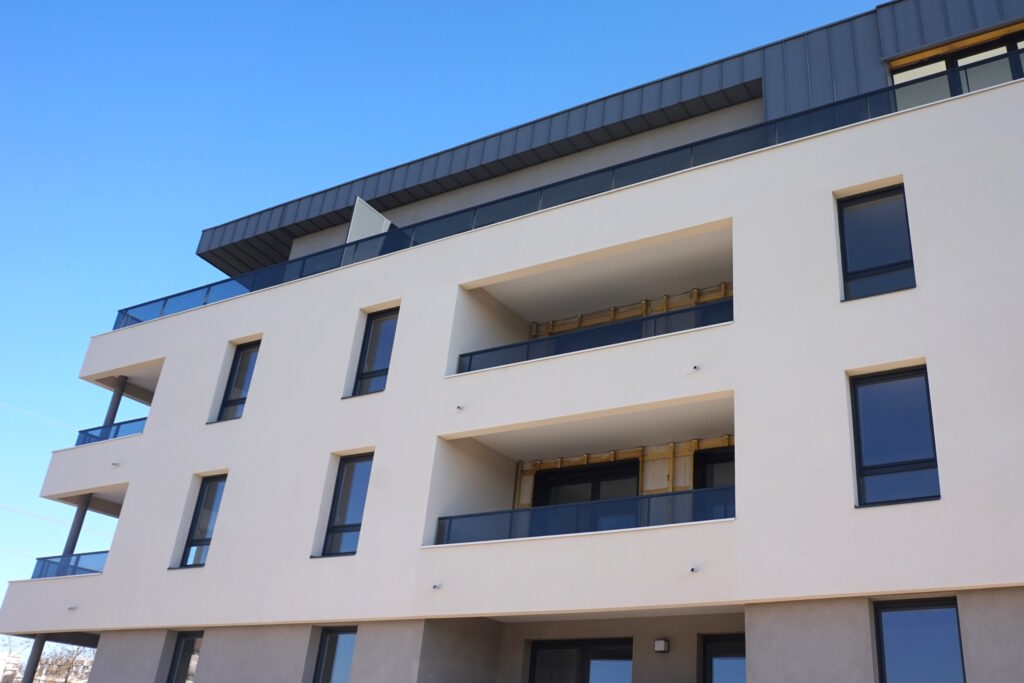 La finition RAL 7016 mat, sobre et contemporaine, structure les lignes du bâtiment et renforce son caractère moderne. Elle crée un contraste élégant avec les façades claires et souligne les volumes des balcons.