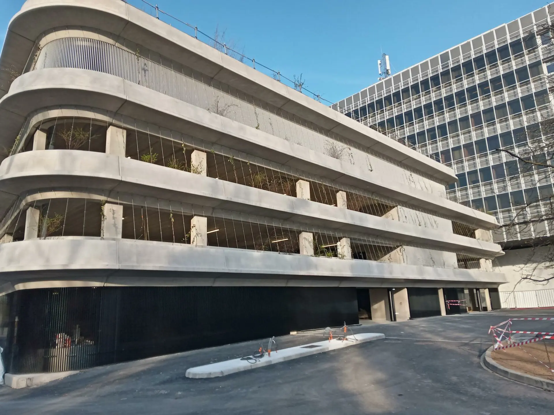 Habillage extérieur et accès d’un bâtiment à usage de parking en étage.