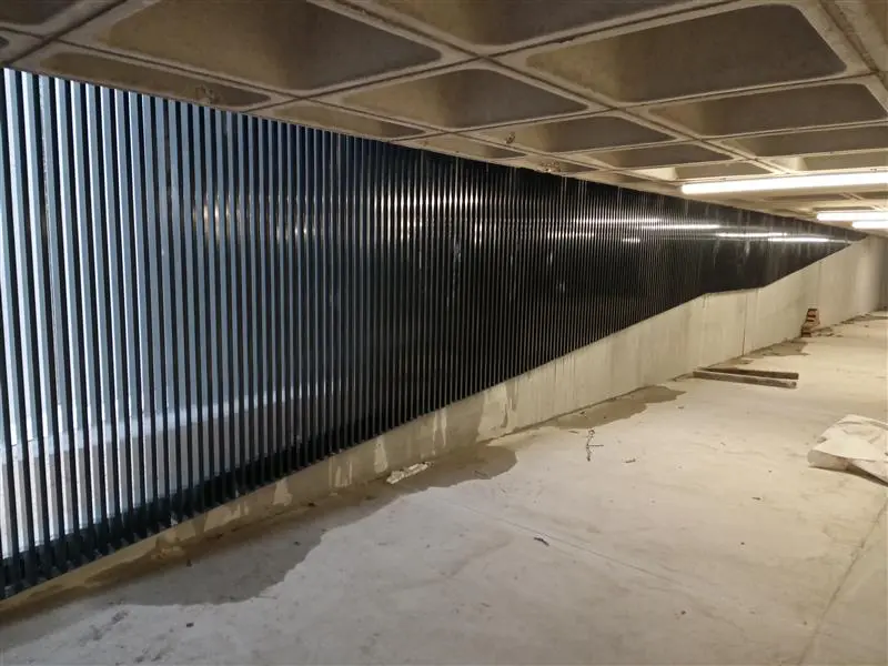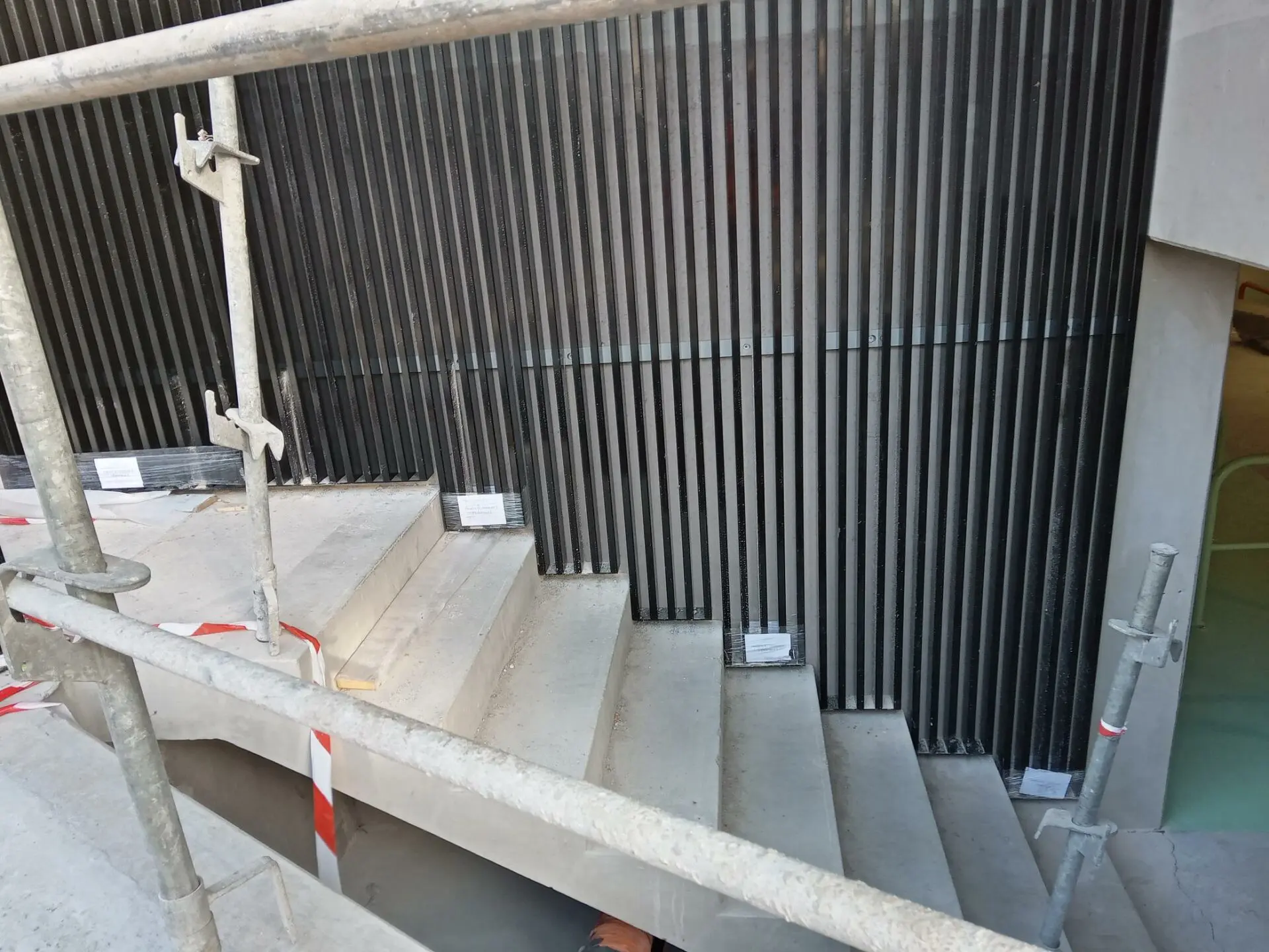 Alugarde déploie ici un savoir-faire parfaitement maîtrisé à la fois dans le traitement de grandes longueurs planes ou arrondies, et dans le traitement des détails comme le long des rampes d’accès automobiles ou en protection au droit des escaliers. Fonctionnellement, le barreaudage forme claustra vers l’extérieur et entre les espaces de circulation piétonne et automobile. Il contribue alors à l’esthétique recherchée par l’architecte. Il joue également aux mêmes endroits un rôle de protection physique des personnes, et répond à ce titre aux normes de sécurité en vigueur. Nos compétences s’expriment aussi en amont, de manière plus discrète mais importante pour la mise en œuvre sur chantier : bien évidemment, les prises de mesures sur chantier ont été faites de telle manière que les produits ont été coupés au nombre et aux dimensions requises, avec tous les accessoires correspondants (caches, quincaillerie de fixation etc.) et que les colisages proposés correspondent aux différentes étapes de montage sur chantier. Les quiproquos, erreurs de montage et pertes de temps sur chantier sont ainsi fortement réduits.