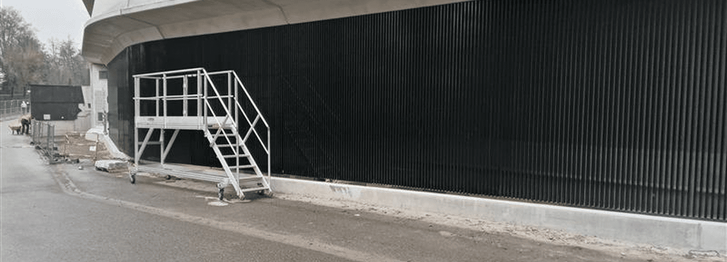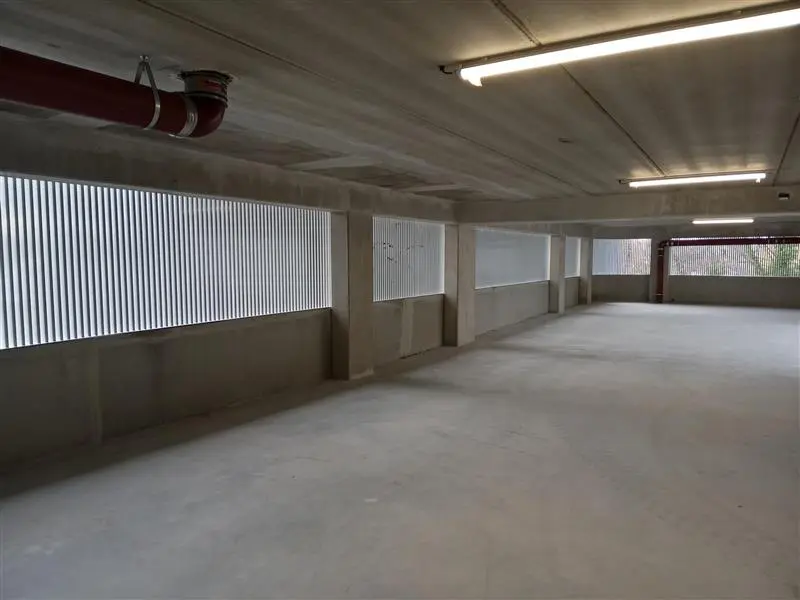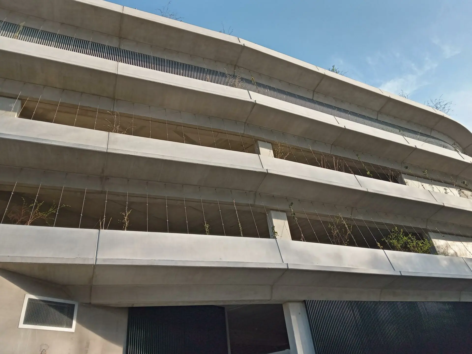 Habillage extérieur et accès d’un bâtiment à usage de parking en étage.