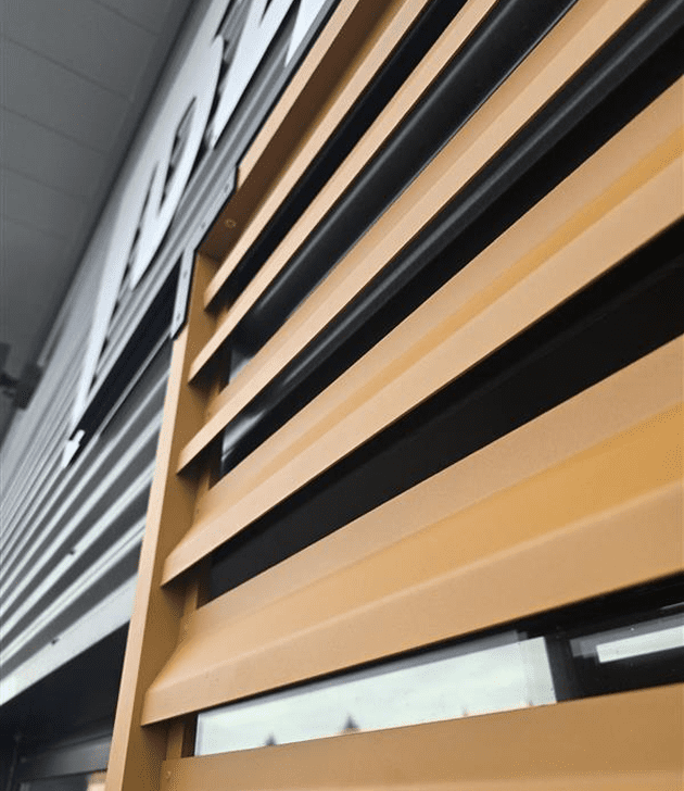 Alugarde montre ici comment se construit un BSO à partir d’un cadre en aluminium thermolaqué renforcé ici par des équerres aux angles. Le choix du profilé du brise-soleil proprement dit, en tôle pliée, plein, de section elliptique… permet de nombreux effets esthétiques, renforcés bien évidemment par le choix de l’inclinaison de la lame et de la couleur. Pour de grandes quantités, nous pouvons bien sûr envisager un profilé spécifique. Nous pouvons aussi réaliser des fixations quasi-invisibles des lames du BSO.